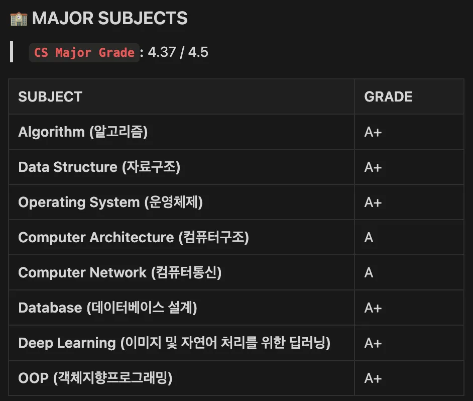알고리즘, 자료구조, 운영체제, 컴퓨터구조, 컴퓨터통신 등 8개의 컴퓨터공학 주요 전공 과목들 모두 A 이상의 성적을 받으며 학부를 마무리하게 되었습니다.