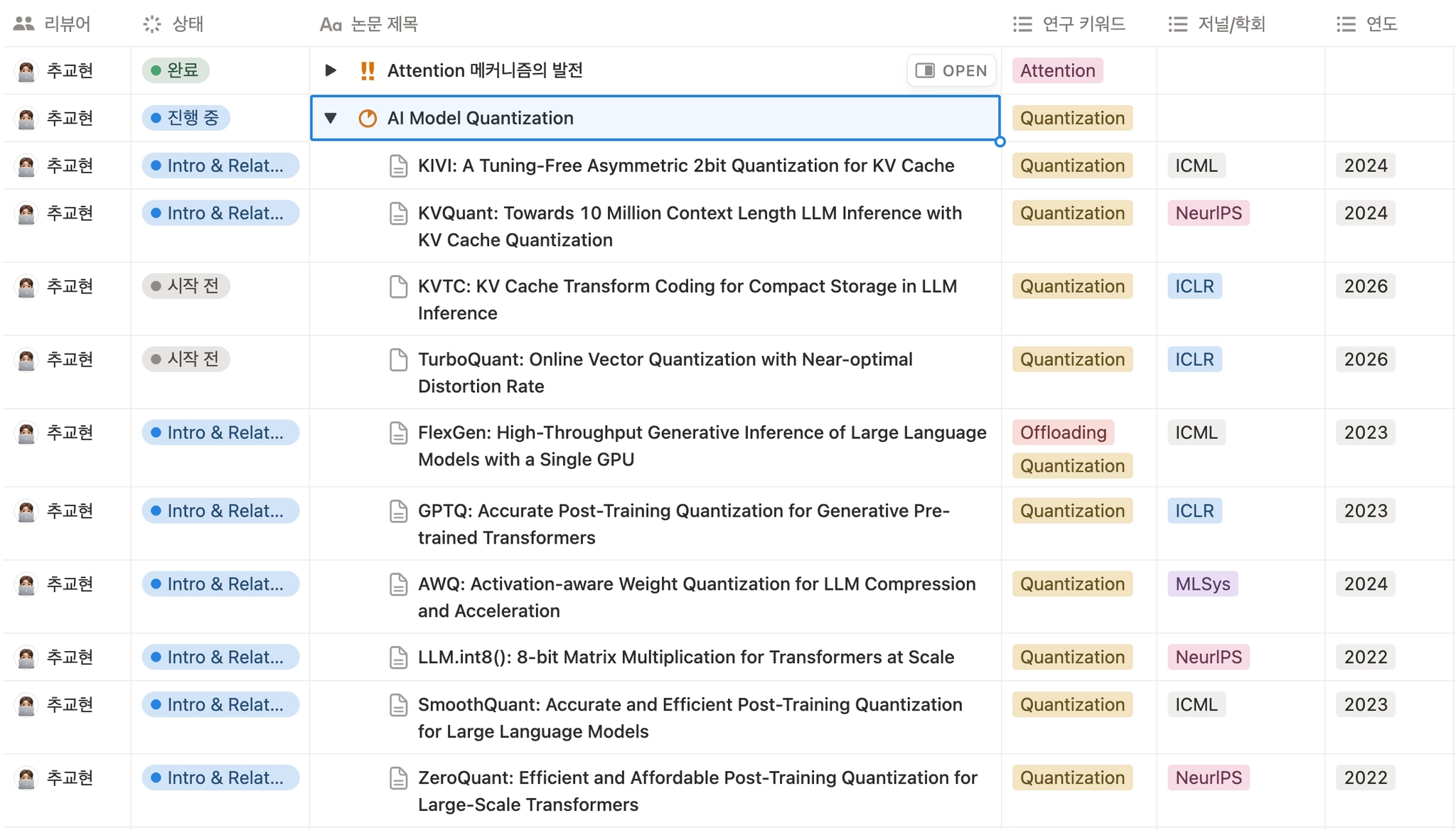 최근에는 본격적으로 KV Cache 양자화(Quantization) 쪽으로 세부 연구 방향을 확정한 뒤, 양자화 쪽 핵심 논문들을 정독하고 있습니다. 최근에 아주 핫했던 구글의 TurboQuant부터 KVTC, LLM.int8(), ZeroQuant, GPTQ, SmoothQuant, FlexGen, AWQ, KIVI, KVQuant까지 총 10편의 양자화 관련 논문을 선정했고, 각 논문의 Introduction과 Related Work를 먼저 훑었습니다. 이를 통해 현재 이 연구 분야에 어떤 문제가 있고, 기존에는 어떤 방식으로 풀어 왔으며, 기존 해결책에는 또 어떤 한계가 있는지, 그리고 각 논문은 그것을 어떤 식으로 풀고자 하는지에 대한 큰 그림을 그릴 수 있었습니다.