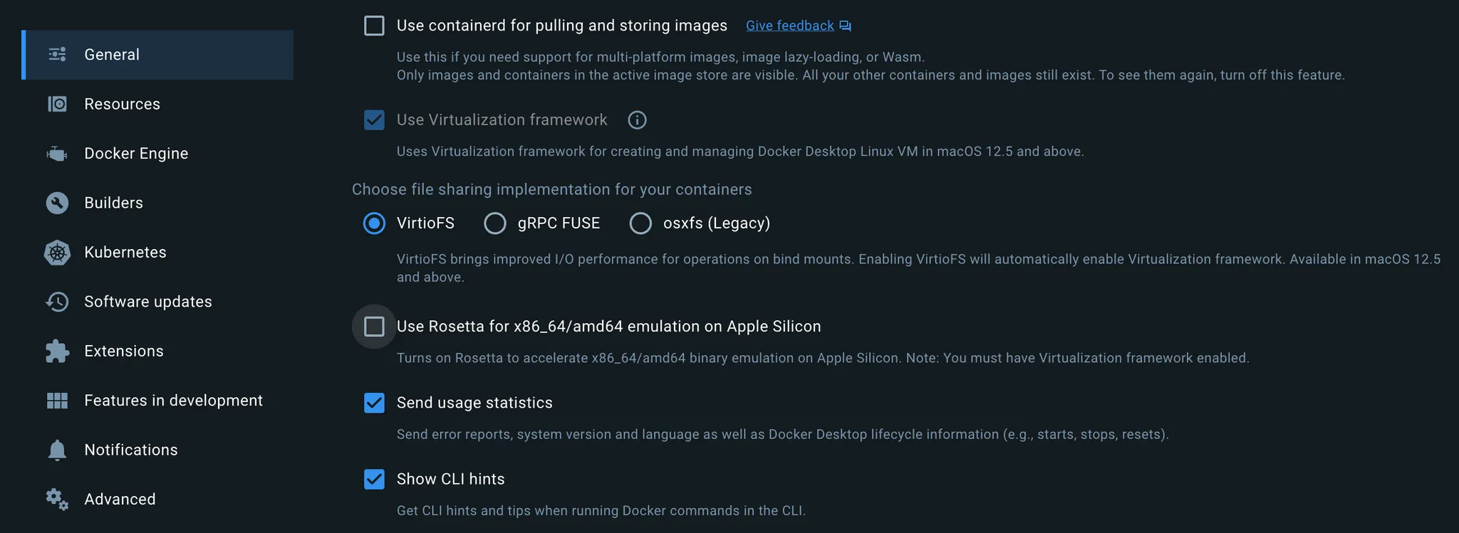 그렇다면, 현재 Docker Settings > General 에서 Use Rosetta for x86_64/amd64 emulation on Apple Silicon 이 체크되어 있을 겁니다. 이 체크를 해제하시면 됩니다.