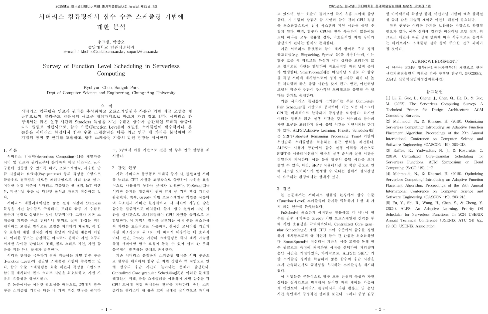 서버리스 컴퓨팅의 서베이 논문을 통해 현재 학계에서 논의되는 핵심 문제들과 해결 방안들을 파악할 수 있었고, 덕분에 제가 집중해야 할 연구 주제와 키워드를 구체화하는 데 큰 도움이 되었습니다.