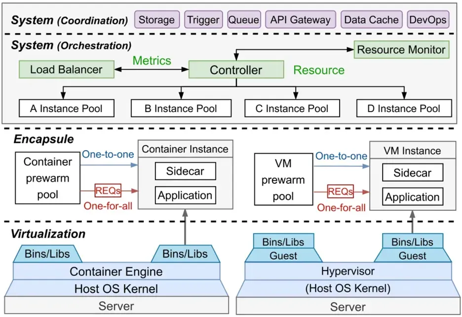 이 논문은 서버리스 시스템을 크게 네 가지 레이어로 분류하여 설명합니다. 가장 하단에는 호스트 OS와 하드웨어를 추상화하는 Virtualization 계층이 존재하며, 그 위에는 애플리케이션과 Sidecar를 패키징하고 Cold Start 방지를 위해 Warm 상태를 관리하는 Encapsulation 계층이 위치합니다. 더 상위에는 자원과 인스턴스 풀의 관리 및 스케줄링을 담당하는 System (Orchestration) 계층과 Event Trigger, Gateway, Storage 등 외부 요소와의 상호작용을 담당하는 System (Coordination) 계층이 있다는 것을 알 수 있었습니다.