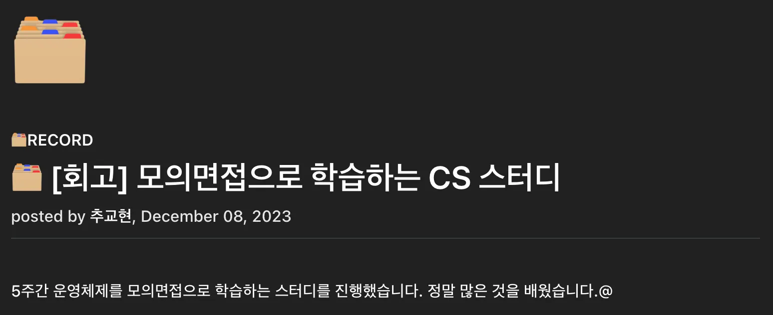 11월부터 12월까지 5주 동안 운영체제를 모의면접 방식으로 학습하는 스터디를 진행했습니다. 이 스터디 하나로 CS 공부, 면접 준비, 블로그 포스팅, 개발자 커뮤니티 참여 등 취업 준비에 필요한 것들을 한 번에 얻을 수 있었습니다.